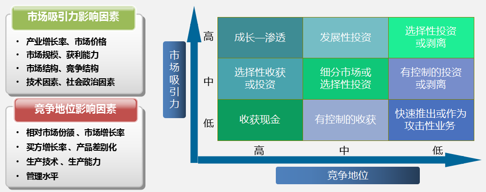 通過分析業(yè)務(wù)的市場吸引力和所處的競爭地位,對戰(zhàn)略事業(yè)單位的業(yè)務(wù)組合進行規(guī)劃,市場吸引力和競爭地位需要綜合分析多種影響因素來確定;
