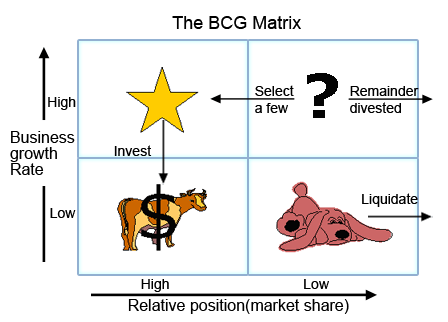 波士頓(BCG)矩陣將組織的每一個(gè)戰(zhàn)略事業(yè)單位(SBUs)標(biāo)在一個(gè)二維矩陣圖上,從而顯示出哪個(gè)SBU提供高額的潛在收益,哪個(gè)SBU是組織資源的漏斗。