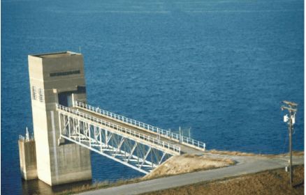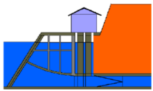②塔式進(jìn)水口:位于水工隧洞或土石壩壩下埋管的首部,是一個不依傍山坡,獨(dú)立于水庫之中的封閉式塔或框架式塔,又稱進(jìn)水塔。塔底裝設(shè)閘門,在塔內(nèi)或頂部布置啟閉機(jī)室。塔式進(jìn)水口受風(fēng)、浪、冰和地震的影響大,穩(wěn)定性不如豎井式,需要較長的工作橋與岸邊或壩頂連接。適用于岸坡低緩、巖石破碎或覆蓋層較厚,不宜采用靠岸進(jìn)口的情況。