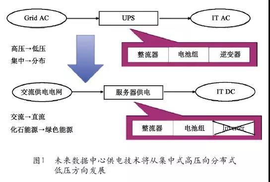 隨著數(shù)據(jù)中心的大規(guī)模建設(shè),用戶更為關(guān)注能源成本和效率。數(shù)據(jù)中心供電技術(shù)未來(lái)的發(fā)展方向一定是市電直供技術(shù),在省去傳統(tǒng)UPS設(shè)備投資和場(chǎng)地占用、降低前期成本的同時(shí),還通過(guò)減少轉(zhuǎn)換級(jí)數(shù)、提高供電效率實(shí)現(xiàn)后期運(yùn)營(yíng)成本的減少。而且這里所說(shuō)的提高效率,不僅僅是指電網(wǎng)側(cè)到IT設(shè)備輸入側(cè)的供電路徑上高效率,而是一次能源側(cè)到CPU等的整個(gè)能源路徑上的高效率和綠色環(huán)保。雖然傳統(tǒng)概念上的PUE值有可能會(huì)升高,但單位計(jì)算能耗是降低的。如圖1所示,未來(lái)數(shù)據(jù)中心供電技術(shù)的總體發(fā)展趨勢(shì)是高壓/集中式/交流大UPS向低壓/分布式/直流小UPS方向發(fā)展,由機(jī)房級(jí)集中式鉛酸電池向IT機(jī)柜甚至服務(wù)器內(nèi)嵌的分布式小(鋰)電池方向發(fā)展,從有污染的化石能源向環(huán)保的綠色能源方向發(fā)展。