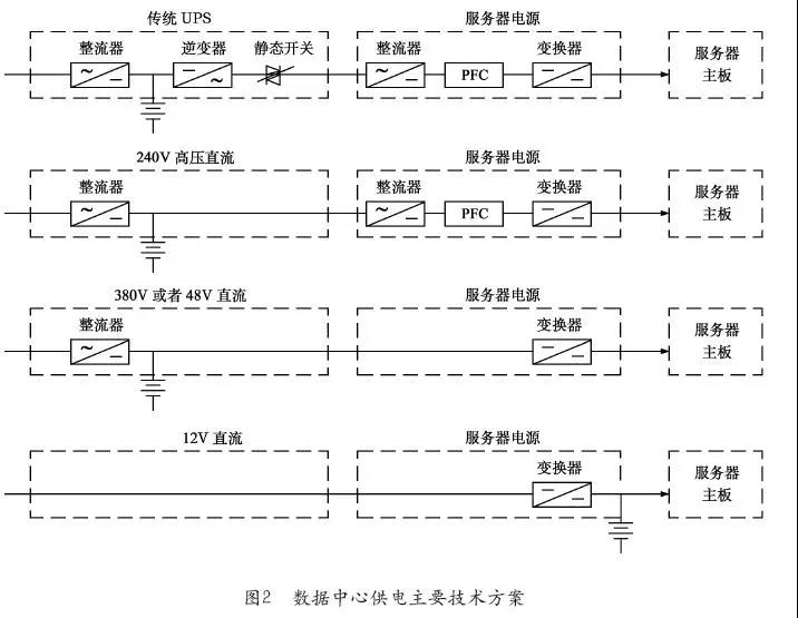 數(shù)據(jù)中心供電不間斷技術(shù)的核心在于UPS及其電池技術(shù),因此不同的電池連接位置也決定了不同的供電架構(gòu)。目前,業(yè)界主流的備用電池電壓從高到低分別有UPS的400多伏,到直流電源的380V、240V及48V,甚至電池內(nèi)嵌到IT設(shè)備內(nèi)的12V等。甚至還有采用飛輪的中壓UPS或者5V等更低電壓的小UPS等,由于應(yīng)用較少,這里不再一一列舉。圖2是目前業(yè)界在數(shù)據(jù)中心供電方面的主要技術(shù)方案,首先從集中式400多伏鉛酸電池的傳統(tǒng)UPS,其次到標(biāo)準(zhǔn)服務(wù)器不用定制、240V電池直掛輸出母線的240V高壓直流技術(shù),接著還有服務(wù)器采用定制48V或者380V輸入電源的48V直流或者380V高壓直流電池直掛技術(shù),最后再到Google等的12V電池直掛服務(wù)器主板輸入方案。電池越靠近末端服務(wù)器主板或者CPU,供電系統(tǒng)越為分散,相應(yīng)的IT系統(tǒng)也更為分布式;電池越靠近末端,供電系統(tǒng)的定制化程度越高,普通用戶規(guī)模開展的難度也越大;電池越靠近末端,對(duì)IT電源及電池的控制管理水平要求也越高。