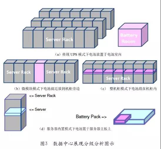 這里還可以從數(shù)據(jù)中心自上而下的不同層級(jí)來(lái)考慮UPS的應(yīng)用場(chǎng)景,典型的數(shù)據(jù)中心可以從整個(gè)園區(qū)、單棟建筑、機(jī)房模塊、微模塊、機(jī)柜、服務(wù)器等不同顆粒度來(lái)劃分。由于整個(gè)園區(qū)、單棟建筑的規(guī)模都太大,目前基本沒有UPS能覆蓋到整個(gè)層級(jí),所以這里不再討論。到機(jī)房模塊層面典型的做法是采用傳統(tǒng)的集中式分體柜級(jí)UPS,微模塊層面典型的做法是采用半分布式一體柜級(jí)UPS,整機(jī)柜層面典型的做法是采用分布式DPS電源插框級(jí)UPS,服務(wù)器層面典型的做法是采用部件級(jí)內(nèi)嵌電池UPS做法,分別如圖3(a)到(d)的四種做法。同樣的,這四種應(yīng)用架構(gòu)下,電池的擺放位置差異也很大,從機(jī)房模塊層面的集中電力電池室,到微模塊層面的半分布電池機(jī)柜,再到整機(jī)柜層面的分布式電池BBU,最后到服務(wù)器層面的部件級(jí)鋰電池包。不同的層級(jí)下不管UPS還是電池的建設(shè)規(guī)模都是從大到小、從集中安裝到分散擺放,從一次性投資到分期投入,故障影響面也是從整個(gè)機(jī)房模塊到單臺(tái)服務(wù)器等。