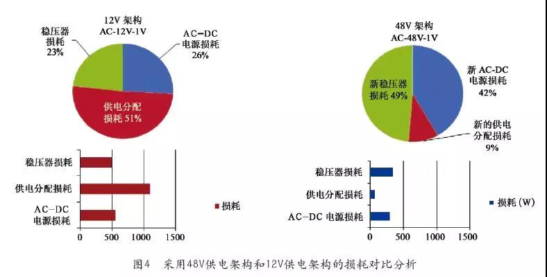 如前面估算,如果12V架構(gòu)下母線電流達(dá)到兩三千安培,那么即便是小到1mΩ的接觸電阻或者線路阻抗下母排損耗都可以達(dá)到4、5千瓦以上,即便采用多個(gè)電源插框或者多根母線來(lái)分?jǐn)傠娏鳒p少損耗,那么不管是總體成本、空間占用、銅消耗、以及能耗等方面都非常大;反之,如果采用48V的母線架構(gòu),電流減少為原來(lái)的四分之一,則母線損耗降低為原來(lái)的1/16,可以大大降低母線損耗和發(fā)熱風(fēng)險(xiǎn)。