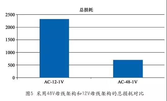 總效率層面,我們還是仍然比較從電網(wǎng)到CPU的整個(gè)供電路徑。首先,市電到母排這一段,48V的通信電源現(xiàn)在效率較容易實(shí)現(xiàn)97%的高效率,而12V服務(wù)器電源多停留在94%左右;其次,母線損耗方面,由于48V架構(gòu)下傳輸和接觸阻抗損耗只是12V架構(gòu)下的1/16,包括了母線段和服務(wù)器主板上的傳輸和接觸阻抗損耗。這里還沒考慮充放電過(guò)程中48V架構(gòu)比12V架構(gòu)少了DC/DC環(huán)節(jié)的損耗;最后,從母線到CPU等這一段,48V到1.3V的BMP磚塊電源也比12V到1.3V的VRM電源效率更高損耗更少。采用48V架構(gòu)比采用12V架構(gòu)總效率提升5%以上,因此從市電到CPU的總效率層面48V架構(gòu)有很大優(yōu)勢(shì)。采用48V母線架構(gòu)和12V母線架構(gòu)的總損耗對(duì)比如圖5所示。