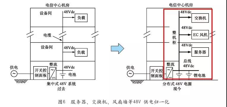 通信產(chǎn)業(yè)經(jīng)過(guò)上百年的發(fā)展,目前在通信行業(yè)48V供電架構(gòu)已經(jīng)非常標(biāo)準(zhǔn)和通用了,產(chǎn)業(yè)鏈和生態(tài)都非常成熟,以至于目前大多數(shù)的網(wǎng)絡(luò)設(shè)備都可以直接支持48V直流供電。甚至在數(shù)據(jù)中心行業(yè)之前也曾嘗試過(guò)采用48V供電架構(gòu),只是傳統(tǒng)的做法是學(xué)UPS將48V電源和電池放到數(shù)據(jù)中心的電力室和電池室。這種做法帶來(lái)的問(wèn)題是傳統(tǒng)的服務(wù)器設(shè)備往往缺乏直接支持48V輸入的電源,以及48V供電在低壓較長(zhǎng)距離傳輸時(shí)帶來(lái)的電源線纜投資、傳輸線路壓降和傳輸線纜損耗等,最終傳統(tǒng)的48V供電技術(shù)在數(shù)據(jù)中心行業(yè)沒能開展起來(lái)。但是隨著整機(jī)柜等技術(shù)的發(fā)展,以及追求低成本高效率、市電直供技術(shù)、大功率機(jī)柜以及鋰電池等技術(shù)的發(fā)展,采用分布式的靠近機(jī)柜甚至機(jī)柜內(nèi)置的48V供電架構(gòu)將會(huì)是未來(lái)發(fā)展的重要方向。服務(wù)器、交換機(jī)、風(fēng)扇墻等48V供電歸一化系統(tǒng)如圖6所示。