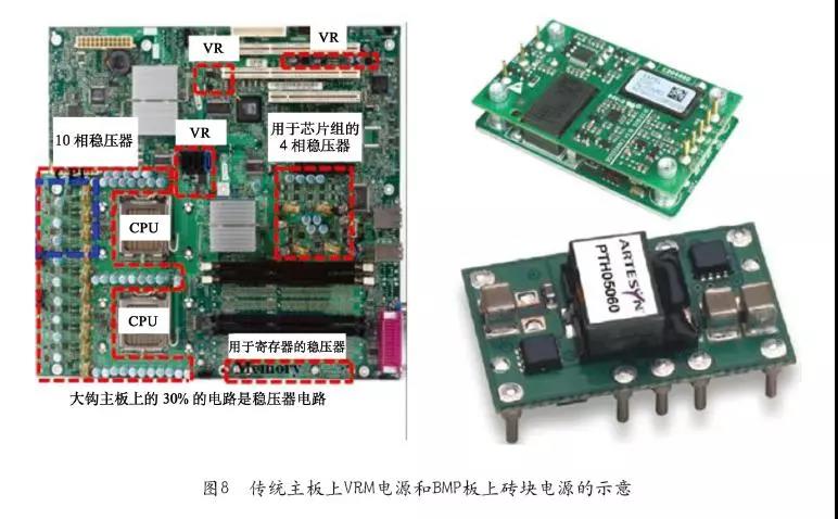 此外,這些VRM電源通常效率不高,能量浪費(fèi)較為嚴(yán)重。我們知道傳統(tǒng)的PUE衡量標(biāo)準(zhǔn)其實(shí)沒考慮服務(wù)器主板上電源帶來(lái)的能量損耗,如果這些VRM電源只有50%的效率,即便機(jī)房級(jí)PUE做到1.0,那么到最后環(huán)節(jié)還是有一半的能源被白浪費(fèi)掉,因此傳統(tǒng)12V架構(gòu)的VRM電源不夠優(yōu)化且有較大提升的空間。如果現(xiàn)有服務(wù)器主板能改采用創(chuàng)新的48V輸入供電架構(gòu),那么真正需要做的只是將這些VRM電源模塊替換成業(yè)界非常通用和成熟的48V輸入BMP板上電源模塊。直接將48V輸入降壓成5V、3.3V和1.3V等,而且這些BMP板上模塊通常比傳統(tǒng)VRM電源效率更高,大規(guī)模應(yīng)用價(jià)格可能還有優(yōu)勢(shì),對(duì)現(xiàn)有服務(wù)器主板也沒有太多影響。因?yàn)檫@些BMP板上電源模塊可以以1/4、1/8磚模塊的方式,采用貼片或者焊接的工藝安裝到主板上,無(wú)需太多電源調(diào)試和主板布局更改,應(yīng)用起來(lái)非常簡(jiǎn)單,而且可復(fù)制通用性強(qiáng)。傳統(tǒng)主板上VRM(電源穩(wěn)壓模塊)和BMP(電源管理板)上磚塊電源的示意圖如圖8所示。