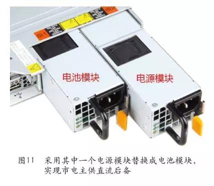 基于前面的思路,如果IT設(shè)備采用內(nèi)嵌鋰電池方案,那么電池該安裝在哪里呢?或者如何做可以更為容易開展?自然而然,我們會(huì)想到電池可以安裝在服務(wù)器主板外和安裝在服務(wù)器主板上的兩個(gè)方案。針對(duì)第一個(gè)方案,如果電池安裝在服務(wù)器主板外,那么采用和服務(wù)器電源一樣封裝的電池模塊會(huì)是最為簡(jiǎn)單的做法。因?yàn)橥ǔ7⻊?wù)器會(huì)配置有兩個(gè)電源模塊,如果將其中的一個(gè)電源模塊更換為一樣外形的電池模塊,并且采用和原來(lái)電源模塊同樣的PIN腳,那么相當(dāng)于電池模塊和電源模塊直接并聯(lián),類似電源冗余備份。市電正常情況下采用市電直供給服務(wù)器主板供電并對(duì)電池模塊充電,市電異常情況下,備份的電池馬上承擔(dān)起全部的服務(wù)器主板負(fù)載,直至柴油發(fā)電機(jī)啟動(dòng)繼續(xù)由電源模塊給服務(wù)器主板供電并重新充滿電池。這種方案下對(duì)現(xiàn)有服務(wù)器基本不用做任何改造,只需換個(gè)電池模塊即可,開展起來(lái)最為簡(jiǎn)單,如圖11所示的做法。