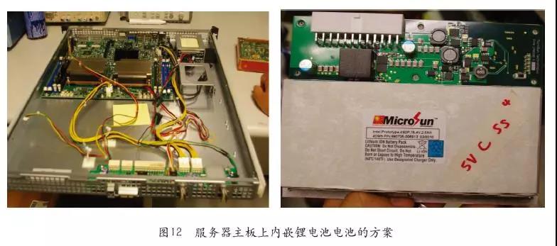 如果采用電池安裝在服務(wù)器主板上的第二種方案,那么就需要在服務(wù)器內(nèi)部做些調(diào)整了。電池可以安裝在服務(wù)器內(nèi)部主板外有空閑的地方,也可以直接安裝在服務(wù)器主板上。具體可以根據(jù)實(shí)際情況靈活選擇,但推薦采用可以熱插拔更換的方式開展。如圖12就是Intel前幾年在IDF上展示的電池內(nèi)置服務(wù)器樣機(jī),電池直接安裝在服務(wù)器的12V輸入,遠(yuǎn)離服務(wù)器發(fā)熱區(qū),并以電池模塊方式來(lái)支持插拔安裝,以及更換。