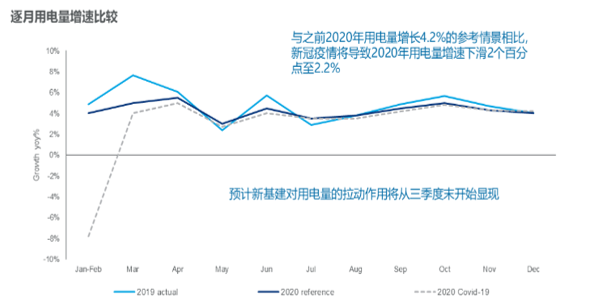 預(yù)計(jì)由于新冠疫情的影響將導(dǎo)致2020年的用電量增速下滑至2%-2.2%,低于往年4%左右的增長(zhǎng),預(yù)計(jì)到本年底新基建的建設(shè)將促進(jìn)電量消耗,增幅或超7%,但包括5G網(wǎng)絡(luò)、高鐵、數(shù)據(jù)中心、AI基建建設(shè)的刺激計(jì)劃是否能在短期內(nèi)恢復(fù)并刺激用電,同時(shí),海外疫情是否能夠有效控制、會(huì)否引發(fā)全球性的經(jīng)濟(jì)大衰退等也為今后兩年的用電量增長(zhǎng)增加較大的不確定性。