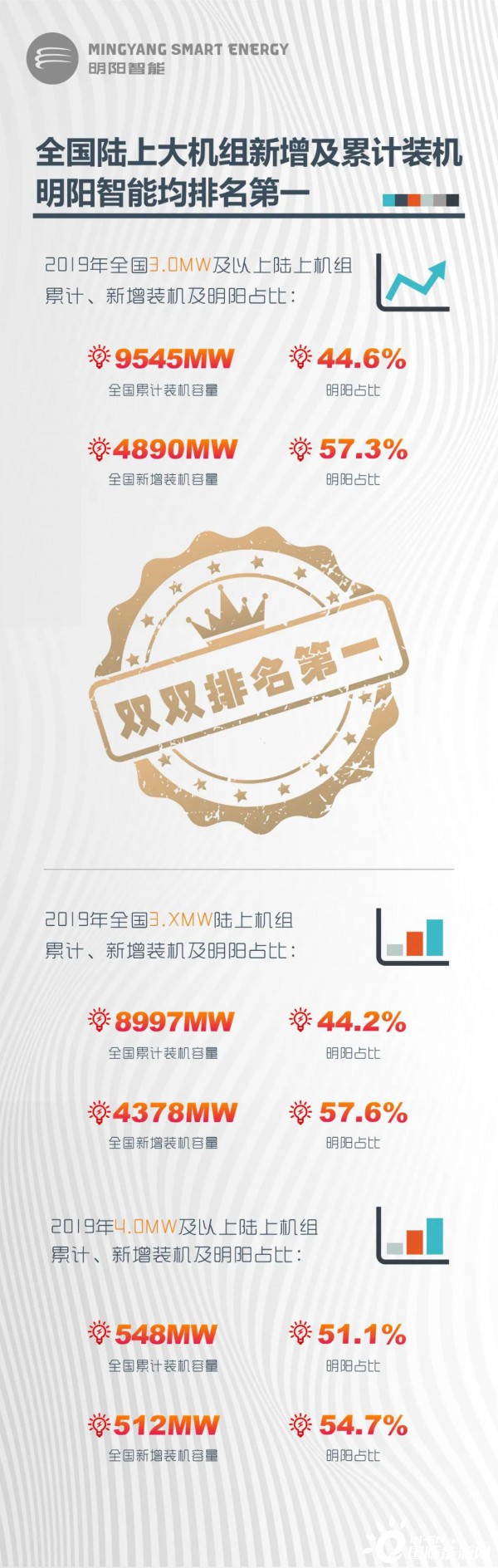 目前,陸上大機(jī)組的“明陽版圖”已初步形成,并持續(xù)穩(wěn)步擴(kuò)大。根據(jù)CWEA數(shù)據(jù),截至2019年底,全國3.0MW及以上陸上風(fēng)電機(jī)組累計(jì)裝機(jī)9545MW,明陽智能占比44.6%;2019年,全國3.0MW及以上陸上風(fēng)電機(jī)組新增裝機(jī)4890MW,明陽智能占比57.3%。在累計(jì)裝機(jī)和2019年新增裝機(jī)上,明陽智能雙雙排名第一。