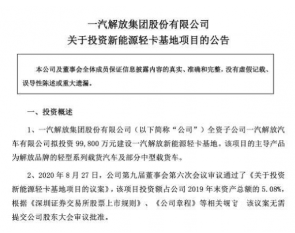 8月31日晚,一汽解放集團(tuán)股份有限公司(以下簡稱“一汽解放”)發(fā)布公告稱,全資子公司一汽解放汽車有限公司擬投資9.98億元建設(shè)一汽解放新能源輕卡基地;該項(xiàng)目的主導(dǎo)產(chǎn)品為解放品牌的輕型系列載貨汽車及部分中型載貨車。
