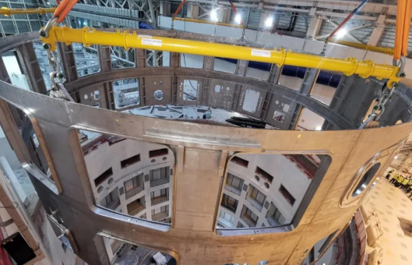 當(dāng)?shù)貢r間8月31日,在法國南部卡達(dá)拉舍,國際熱核聚變實驗堆(ITER)托卡馬克裝置第二個重大部件——杜瓦下部筒體吊裝工作完成,杜瓦下部筒體吊裝是中核集團(tuán)中國核電工程有限公司牽頭的中法聯(lián)合體團(tuán)隊在法國“帶疫解封”嚴(yán)峻形勢下完成的第二個重大安裝任務(wù)。
