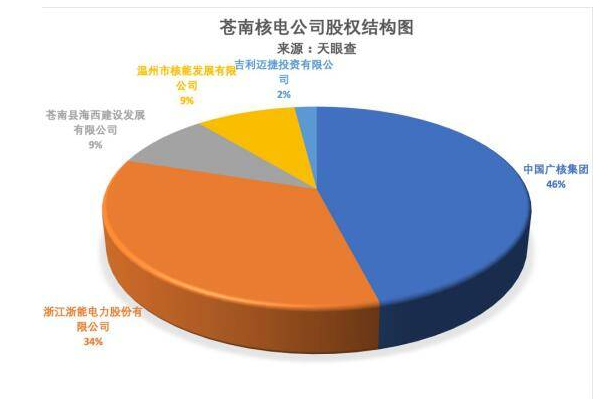 另一個(gè)獲得核準(zhǔn)的項(xiàng)目是浙江三澳核電站,該電站位于浙江省溫州市蒼南縣,由中廣核負(fù)責(zé)開發(fā),也是中廣核第一個(gè)在浙江獲得核準(zhǔn)開發(fā)的核電項(xiàng)目。中廣核持有項(xiàng)目公司中廣核蒼南核電46%的股份,是第一大股東。其余投資者中,地方能源國企浙能電力持股34%,蒼南縣和溫州市地方國資控股的公司蒼南海西建設(shè)發(fā)展公司、溫州市核能發(fā)展公司各持股9%,還有2%的股份則是吉利科技集團(tuán)控股的吉利邁捷投資集團(tuán)持有。