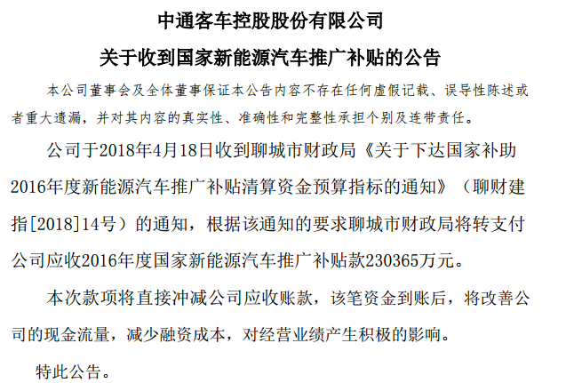 4月19日,中通客車發(fā)布公告稱,公司于2018年4月18日收到聊城市財政局《關于下達國家補助2016年度新能源汽車推廣補貼清算資金預算指標的通知》(聊財建 指[2018]14號)的通知,根據(jù)該通知的要求聊城市財政局將轉支付公司應收2016年度國家新能源汽車推廣補貼款230365萬元。