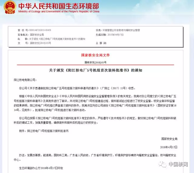 2018年4月17日,國(guó)家核安全局頒發(fā)《陽(yáng)江核電廠5號(hào)機(jī)組首次裝料批準(zhǔn)書(shū)》(國(guó)核安發(fā)[2018]103號(hào)),批準(zhǔn)陽(yáng)江核電廠5號(hào)機(jī)組首次裝料活動(dòng)。