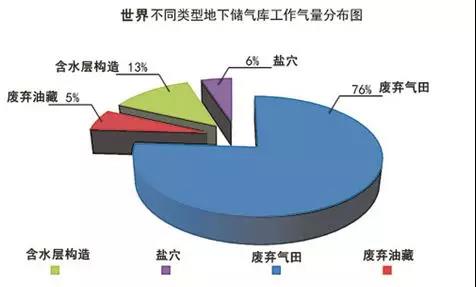 其中,枯竭油氣藏成為儲氣庫建設(shè)的主力。例如,從世界不同類型地下儲氣庫工作氣量分布來看,廢棄氣田和廢棄油藏的工作氣量分別占到了76%和5%。