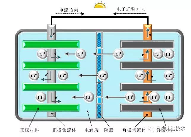 鋰電池被稱為“搖椅型”電池,帶電離子在正負極之間運動,實現(xiàn)電荷轉移,給外部電路供電或者從外部電源充電。具體的充電過程中,外電壓加載在電池的兩極,鋰離子從正極材料中脫嵌,進入電解液中,同時產(chǎn)生多余電子通過正極集流體,經(jīng)外部電路向負極運動;鋰離子在電解液中從正極向負極運動,穿過隔膜到達負極;經(jīng)過負極表面的SEI膜嵌入到負極石墨層狀結構中,并與電子結合。