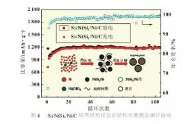 核殼結(jié)構(gòu)構(gòu)造的目的在于通過外殼的基本特性為硅或硅合金的體積膨脹提供緩沖層,將硅或硅合金的體積效應(yīng)控制在核殼結(jié)構(gòu)內(nèi)。研究人員進行了大量關(guān)于核殼結(jié)構(gòu)的研究。圖4為Si/NiSi2/Ni/C核殼結(jié)構(gòu)樣品的結(jié)構(gòu)示意圖及循環(huán)曲線。