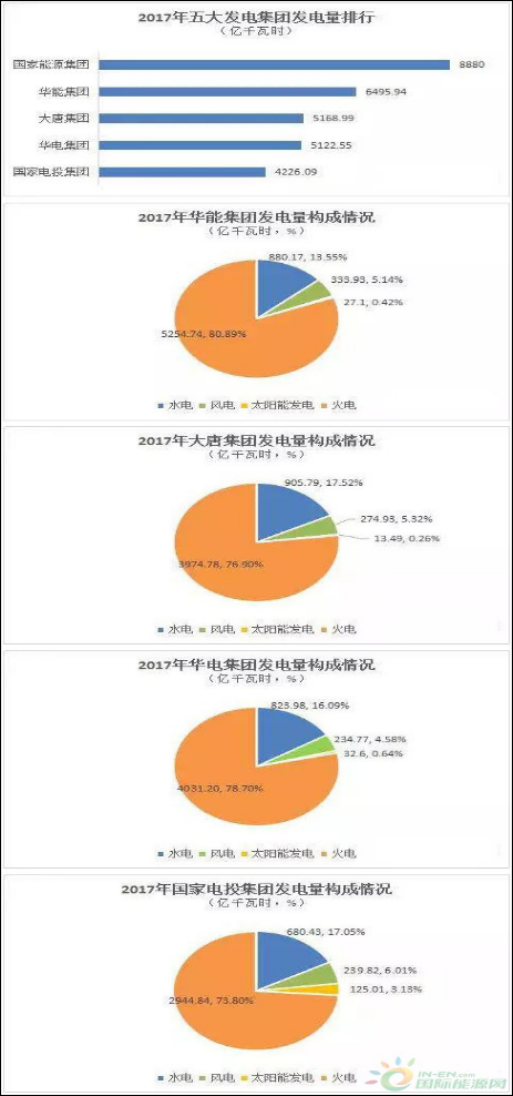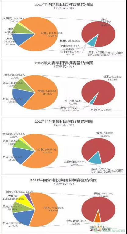 2017年,華能集團(tuán)電力投資380.46億元,其中,水電102.89億元,火電104.22億元,風(fēng)電97.31億元,太陽能發(fā)電59.76億元,其他16.28億元;大唐集團(tuán)電力投資313.92億元,其中,水電62.63億元,火電148.79億元,風(fēng)電92.7億元,太陽能發(fā)電9.8億元;華電集團(tuán)電力投資332.53億元,其中,水電92.96億元,火電160.31億元,風(fēng)電45.59億元,太陽能發(fā)電33.66億元;國(guó)家電投集團(tuán)電力投資778.76億元,其中,水電26.16億元,火電225.71億元,風(fēng)電177.4億元,太陽能發(fā)電265.42億元,其他63.87億元。國(guó)家能源集團(tuán)電源投資占總投資68%,水電、風(fēng)電等可再生能源投資占主業(yè)投資31%。