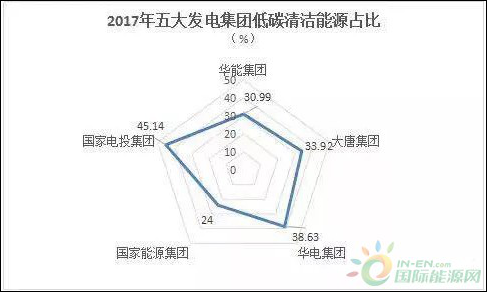 2017年,國(guó)家電投集團(tuán)低碳清潔能源比重最高,為45.14%,華電集團(tuán)次之,為38.63%,接下來分別是大唐集團(tuán)33.92%,華能集團(tuán)30.99%,國(guó)家能源集團(tuán)24%。