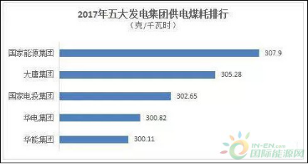 2017年,國(guó)家能源集團(tuán)供電煤耗為307.9克/千瓦時(shí),同比減少2.8克/千瓦時(shí);大唐集團(tuán)305.28克/千瓦時(shí),同比減少1.57克/千瓦時(shí);國(guó)家電投集團(tuán)302.65克/千瓦時(shí),同比減少2.25克/千瓦時(shí);華電集團(tuán)300.82克/千瓦時(shí),同比減少2.24克/千瓦時(shí);華能集團(tuán)300.11克/千瓦時(shí),同比減少2.24克/千瓦時(shí)。