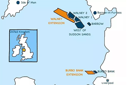 Walney Extension風(fēng)場位于英國Cumbria附近的愛爾蘭海域,離岸20公里,水深20到37米,其中西區(qū)安裝了40臺 MHI VestasV164-8MW 風(fēng)力發(fā)電機(可功率提升到8.25MW),東區(qū)安裝了47臺Siemens Gamesa SWT-154-7.0風(fēng)機(該機型第一次在風(fēng)場安裝使用)。