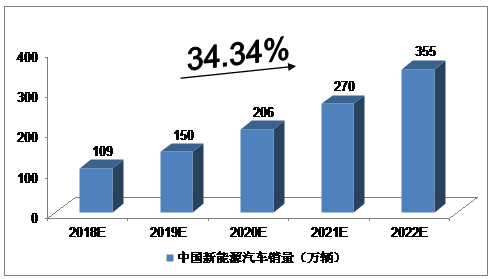 2018年我國(guó)新能源汽車(chē)銷(xiāo)量將達(dá)到109萬(wàn)輛,未來(lái)五年(2018-2022)年均復(fù)合增長(zhǎng)率約為34.34%,2022年將達(dá)到355萬(wàn)輛。