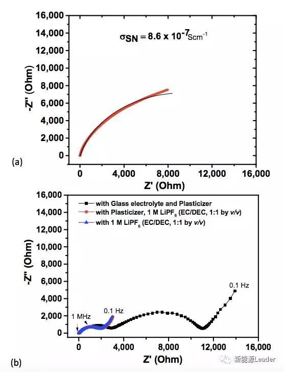 此外Goodenough老爺子發(fā)現(xiàn)隨著全固態(tài)電池循環(huán)次數(shù)的增加,上述電池的正極材料比容量和電壓平臺會呈現(xiàn)出不斷增加的趨勢,例如實(shí)驗(yàn)中全固態(tài)電池采用的正極材料為Li[LixNi0.5-yMn1.5-z]O4-x-δFx(x=y+z≈0.36,δ≈0.36)(LNMO)材料循環(huán)300多次后從最初的79mAh/g提高到了586mAh/g,這甚至要高于LNMO材料的理論容量(241mAh/g)。針對這一現(xiàn)象Goodenough認(rèn)為主要是雙電層電容在起作用,從下面a中我們可以看到丁二腈塑化劑SN的離子電導(dǎo)率非常低僅為10-7S/cm,同時由于正極加入了SN,Li+-玻璃電解質(zhì)和SN塑化劑界面產(chǎn)生了非常大的阻抗,達(dá)到11kW,這導(dǎo)致了Li+幾乎不可能穿越SN塑化劑-Li+-玻璃電解質(zhì)界面,因此在充電的過程中,Li+-玻璃電解質(zhì)中的Li+會擴(kuò)散到金屬Li負(fù)極的表面,沉積成為金屬Li,由于沒有來自正極的Li+補(bǔ)充,從而導(dǎo)致Li+-玻璃電解質(zhì)帶負(fù)電。在正極一側(cè),電子從LNMO顆粒離開,使得LNMO顆粒帶正電,SN塑化劑電解質(zhì)中的陰離子會聚集在正極材料顆粒表面形成雙電層電容,而在SN塑化劑-Li+-玻璃電解質(zhì)界面也因?yàn)楦髯圆煌碾姾桑纬呻p電層電容,從而推高了電池整體的容量。