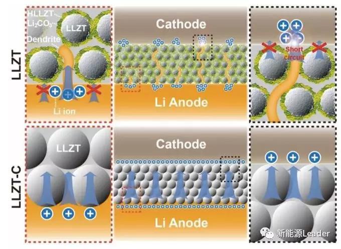 Goodenough認(rèn)為造成Li7La3Zr2O12界面阻抗的關(guān)鍵因素在于其表面的Li2CO3和晶界處的Li-Al-O玻璃相的存在,抑制了Li+的擴(kuò)散速度,為了解決這一問題,Goodenough和他的團(tuán)隊采用了碳還原的方法對Li7La3Zr2O12進(jìn)行了處理,消除了表面的Li2CO3,并減少了晶界處的Li-Al-O玻璃相,顯著降低了界面阻抗。