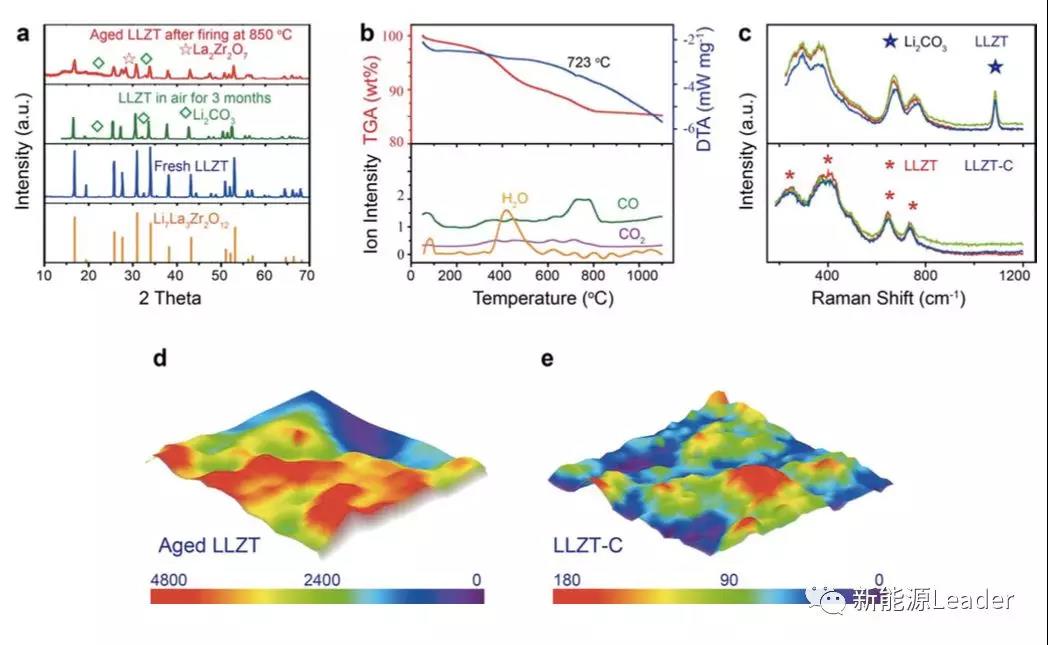 通過XRD數(shù)據(jù)(下圖a)我們能夠觀察到在空氣中經(jīng)過3個月老化的Li7La3Zr2O12材料產(chǎn)生了數(shù)量可觀的Li2CO3,同時材料的Li+電導(dǎo)率也從5′10-4S/cm下降到了2′10-4S/cm。而拉曼光譜的研究則表明經(jīng)過700℃碳還原處理的Li7La3Zr2O12材料表面未觀察到Li2CO3,而普通Li7La3Zr2O12材料則觀察到了非常強(qiáng)的Li2CO3峰,XPS測試也表明經(jīng)過碳還原處理的Li7La3Zr2O12材料表面沒有Li2CO3的存在。
