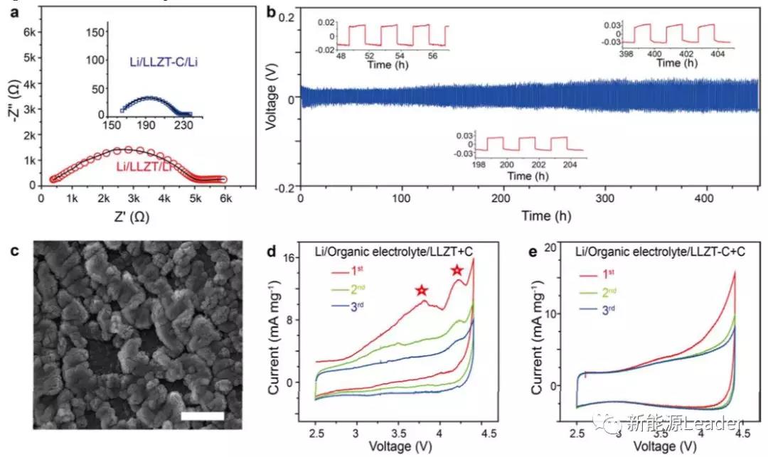 在另一篇文章Garnet electrolyte with an ultra-low interfacial resistance for Li-metal batteries中,Goodenough則通過簡單的碳還原處理工藝【5】,消除了石榴石結(jié)構(gòu)固態(tài)電解質(zhì)Li7La3Zr2O12表面的Li2CO3雜相,顯著降低了石榴石結(jié)構(gòu)電解質(zhì)的界面阻抗,同時碳還原處理也顯著減少了固態(tài)電解質(zhì)晶界處Li-Al-O玻璃相的數(shù)量,從而降低了電解質(zhì)內(nèi)的晶界電阻,研究表明經(jīng)過處理后的石榴石電解質(zhì)與Li、LiFePO4和有機(jī)液態(tài)電解液的界面阻抗分別降低到了28、92和45W/cm2(65℃),顯著減少了電池極化,提升了庫倫效率和循環(huán)穩(wěn)定性。