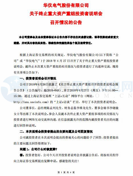 北極星風(fēng)力發(fā)電網(wǎng)獲悉,根據(jù)上海證券交易所的相關(guān)規(guī)定,華儀電氣于 2018 年 4 月 27 日召開了關(guān)于終止重大資產(chǎn)重組投資者說明會,就終止本次重大資產(chǎn)重組的相關(guān)情況與投資者進(jìn)行了溝通和交流。