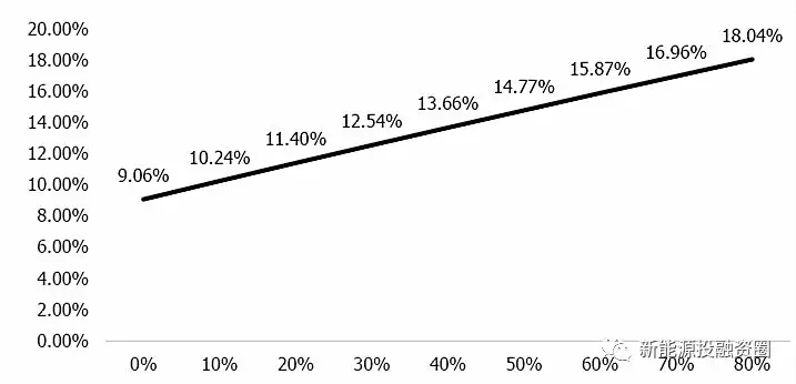 因為相較于風(fēng)電標(biāo)桿上網(wǎng)電價,自發(fā)自用所對應(yīng)的電價更可觀。假設(shè)工商業(yè)峰值電價在1.2元/kwh ,平時電價在0.6元/ kwh,峰時占比為42%,脫硫燃煤標(biāo)桿電價0.35元/ kwh,電價折扣為85折,在自發(fā)自用優(yōu)惠比例70%的情況下,自用部分對應(yīng)的電價在0.6元/ kwh ,仍高于2018年第四類資源區(qū)上網(wǎng)標(biāo)桿電價。 假設(shè)在第一類資源區(qū),執(zhí)行2018 年標(biāo)桿電價的分散式風(fēng)電項目,建造成本在7.5元/w,利用小時數(shù)為2000小時,那么自發(fā)自用比例從0%提高到80%,IRR會從原有的9%提高到18%。自用比例與IRR關(guān)系見下圖: