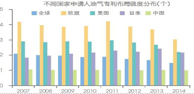 專利申請人完成技術創(chuàng)新后,通常會在其所屬國家進行基本專利申請,隨后以該基本專利為優(yōu)先權通過巴黎公約組織或?qū)@献鲄f(xié)定(PCT)途徑謀求在全球的多個國家進行專利布局形成同族專利,平均每件專利布局國家數(shù)量的多少即為專利布局強度。全球油氣領域基本專利平均布局國家或地區(qū)數(shù)量呈現(xiàn)逐年降低趨勢,布局強度從2007年的2.09個國家降至2014年的1.67個國家。美國及歐盟的機構和個人主要在中國、美國、歐盟、澳大利亞、加拿大、俄羅斯、巴西等技術市場及油氣資源國家進行專利布局,每件基本專利的布局國家數(shù)分別從2007年的2.91個國家和4.18個國家降至2014年的2.20個國家和3.02個國家。日本機構和個人專利布局強度低于美國及歐盟,但專利布局意識逐步提高,每件基本專利的布局國家數(shù)分別從2007年的1.94個國家提升至2014年的2.15個國家。中國機構及個人還停留在油氣專利本土防御階段,遠未實現(xiàn)專利布局“走出去”,每件基本專利的布局國家數(shù)一直維持在1.03個國家水平,尚無法完成對技術、產(chǎn)品及服務市場的完全保護。從進入國外市場進行專利布局的途徑來看,全球通過PCT方式進入多國進行布局的油氣基本專利占比為20%左右;歐盟及美國機構和個人通過PCT方式進入多國布局的基本專利占比分別達到55%和68%;日本機構和個人對PCT途徑重視程度逐步增加,占比從20%提升至33%;中國PCT機構和個人對PCT途徑重視程度很低,占比不足1%。