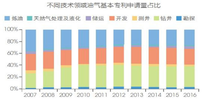 2007~2013年,全球油氣價格處于上升期,提高油氣資源供給量成為各企業(yè)的關注點,上游領域成為技術研發(fā)和專利布局的重點,勘探、鉆井及開發(fā)等技術領域是專利申請的熱門,在油氣基本專利中的占比分別從2007年的1.05%、27.92%和31.665提高至2013年的3.56%、45.69%和36.72%;而測井、儲運、煉油等技術領域基本專利占比則從5.64%、4.13%、41.43%萎縮至4.44%、3.53%和32.0%。隨著全球油氣價格在2014年下半年“斷崖式”下跌并進入低位區(qū)間,全球油氣研發(fā)重點發(fā)生逆轉(zhuǎn),測井、儲運、煉油等技術領域基本專利占比分別上升至4.74%、4.60%和33.35%,而勘探、鉆井及開發(fā)領域?qū)@急葎t分別降至3.32%、43.49%、34.66%。天然氣是溫室氣體及污染物排量最低的化石能源,被公認為新一輪能源轉(zhuǎn)型的橋梁。因此,天然氣處理與液化領域的專利申請量呈現(xiàn)逐年增加的趨勢,在油氣領域基本專利中的占比從2007年的0.58%增加至當前的2%左右。