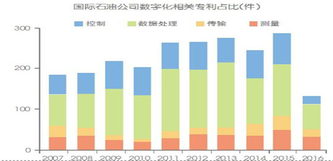 通過實施數(shù)字化轉(zhuǎn)型戰(zhàn)略提高生產(chǎn)效率、降低操作成本成為國際石油公司提質(zhì)增效的重要選擇,各公司充分利用新型測量、計算、通訊、控制、模擬仿真等方法和手段推進生產(chǎn)運營的自動化、智能化。2007~2015年,國際石油公司申請的數(shù)字化相關專利占比從不足15%逐步提高至22%。10年間,五大國際石油公司累計申請數(shù)字化相關基本專利2253件,占基本專利總量的17.80%。其中,道達爾、雪佛龍公司數(shù)字化專利占比分別達到21.6% 和18.9%;?松梨跀(shù)字化專利占比最低,也達到10.3%。從數(shù)字化相關專利涉及的技術分類來看,測量方法與設備、信號傳輸方法與設備、數(shù)據(jù)處理方法與軟件、控制方法與設備所占比例分別為16.9%、9.0%、45.3%和28.8%。煉油化工、鉆井、油氣開發(fā)是數(shù)字化技術的主要應用技術領域,占數(shù)字化相關專利總量的80%以上。