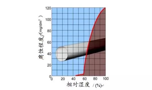 通過控制風(fēng)力發(fā)電機(jī)組艙內(nèi)環(huán)境空氣的相對(duì)濕度以阻止鹽霧腐蝕的發(fā)生。鹽霧腐蝕本質(zhì)是電化學(xué)腐蝕,當(dāng)艙內(nèi)環(huán)境空氣濕度低于金屬的臨界相對(duì)濕度時(shí)便可阻止電化學(xué)腐蝕的發(fā)生,如圖2所示。海上風(fēng)電機(jī)組在艙內(nèi)設(shè)置有除濕系統(tǒng),配合機(jī)艙在鹽霧濃度控制技術(shù)的基礎(chǔ)上,可以有效保證機(jī)艙和風(fēng)輪內(nèi)部濕度小于等于50%,以阻止艙內(nèi)金屬零部件腐蝕的發(fā)生。