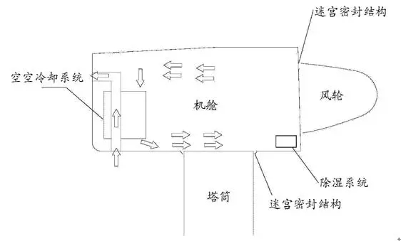 海上風(fēng)電機(jī)組機(jī)艙和塔筒相連,塔筒內(nèi)部設(shè)置有鹽霧過濾系統(tǒng),可以保證風(fēng)電機(jī)組整機(jī)內(nèi)部處于微正壓狀態(tài),并且整機(jī)各個(gè)連接部位通過迷宮密封+密封圈的密封方式進(jìn)行密封。通過微正壓技術(shù)和迷宮密封+密封圈的密封方式,可以有效保證機(jī)組整機(jī)的密封結(jié)構(gòu),同時(shí)能保證鹽霧顆粒折向沉積以阻止其進(jìn)入艙內(nèi)。