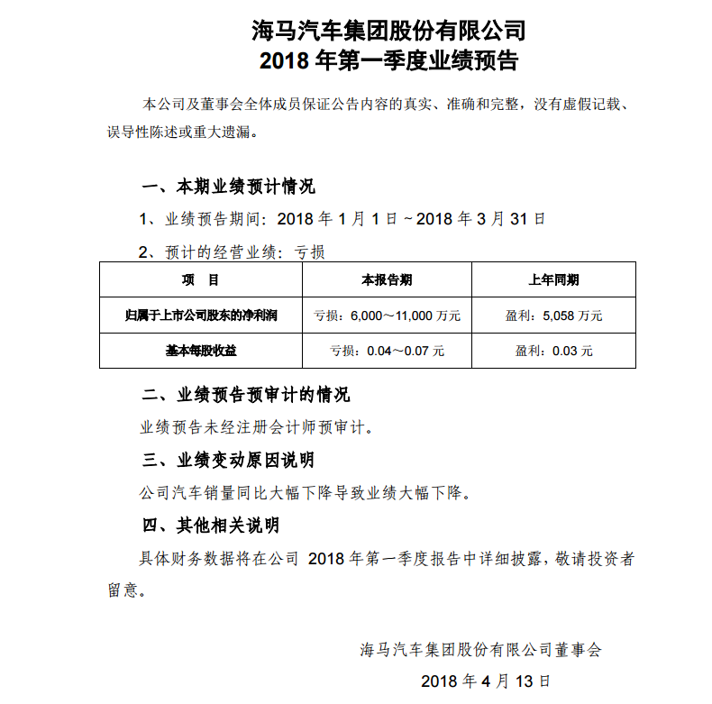 如今,2018年第一季度業(yè)績(jī)報(bào)告也已經(jīng)出爐,海馬汽車銷量仍在大幅下降而導(dǎo)致公司業(yè)績(jī)?nèi)栽诖蠓陆。公告?nèi)容如下: