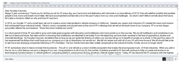 在內(nèi)部信中,F(xiàn)F稱自身目前已是互聯(lián)網(wǎng)及消費電子行業(yè)人才比例最高的電動車公司, 將繼續(xù)商業(yè)模式和運營模式的變革,重構(gòu)傳統(tǒng)汽車經(jīng)銷模式。FF稱要將夢想照進現(xiàn)實!