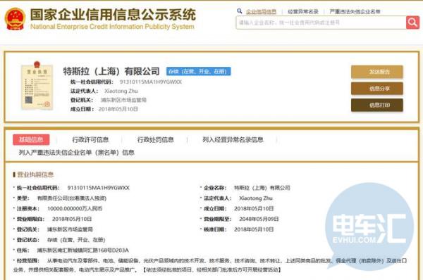 近日,據(jù)國(guó)家企業(yè)信用信息公示系統(tǒng)查詢(xún)顯示,特斯拉(上海)有限公司于5月10日獲上海浦東新區(qū)市場(chǎng)監(jiān)管局核發(fā)的營(yíng)業(yè)執(zhí)照,特斯拉(上海)有限公司注冊(cè)資本1億元,股東為特斯拉汽車(chē)香港有限公司,公司成立日期為5月10日,經(jīng)營(yíng)范圍:從事電動(dòng)汽車(chē)及零部件、電池、儲(chǔ)能設(shè)備、光伏產(chǎn)品領(lǐng)域內(nèi)的技術(shù)開(kāi)發(fā)、技術(shù)服務(wù)、技術(shù)咨詢(xún)、技術(shù)轉(zhuǎn)讓?zhuān)鲜鐾?lèi)商品的批發(fā)、傭金代理(拍賣(mài)除外)及進(jìn)出口業(yè)務(wù),并提供相關(guān)配套服務(wù),電動(dòng)汽車(chē)展示及產(chǎn)品推廣。