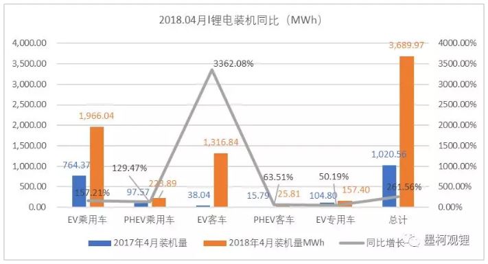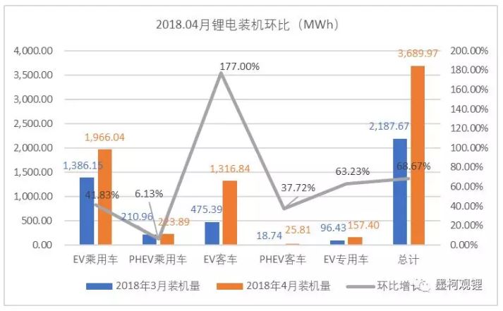真鋰研究的統(tǒng)計數(shù)據(jù)顯示,2018年4月中國電動汽車市場實現(xiàn)鋰電裝機3.69GWh,同比增長261.56%,環(huán)比增長了68.67%。在國家補貼政策的過渡期,各企業(yè)還是謹(jǐn)慎生產(chǎn),平穩(wěn)發(fā)展。