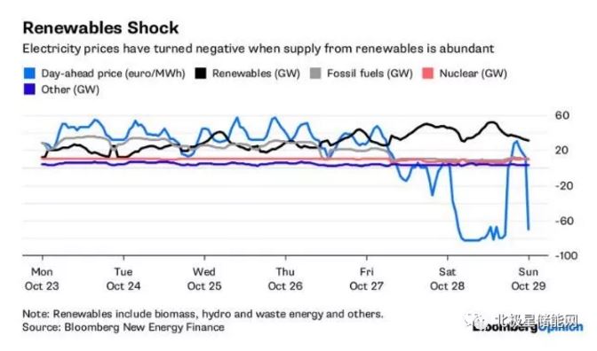 這就是儲能可以發(fā)掘的市場。大多數(shù)電力市場的結(jié)構(gòu)是實時拍賣的形式。其中一個結(jié)果是,在可再生能源普及率最高的情況下,批發(fā)電價偶爾會降至零甚至進入負值區(qū)域,正如BNEF的這張圖表所示: