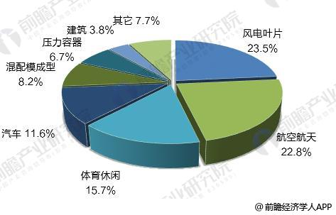 碳纖維是發(fā)展國(guó)防軍工與國(guó)民經(jīng)濟(jì)的重要戰(zhàn)略物資,廣泛應(yīng)用于風(fēng)電葉片、航空航天、體育用品、汽車工業(yè)、混配模成型、壓力容器、建筑補(bǔ)強(qiáng)、電子電器等領(lǐng)域。2017年,風(fēng)電葉片依然是碳纖維第一大應(yīng)用領(lǐng)域,其消費(fèi)占碳纖維總需求量的23.5%;航空航天是除風(fēng)電葉片外的碳纖維第二大應(yīng)用領(lǐng)域,其消費(fèi)量占碳纖維總量的22.8%;體育休閑、汽車工業(yè)、混配模成型、壓力容器、建筑補(bǔ)強(qiáng)的消費(fèi)量分別占碳纖維總需求量的15.7%、11.6%、8.2%、6.7%、3.8%。