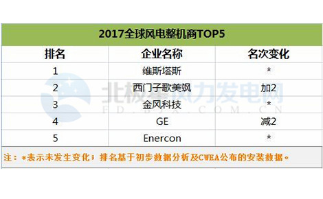 GE跌至第四位。Enercon由于其在德國國內(nèi)市場的強勁增長,繼續(xù)位居第五位。2017年,Enercon在德國安裝了近6.5GW,創(chuàng)造了記錄。