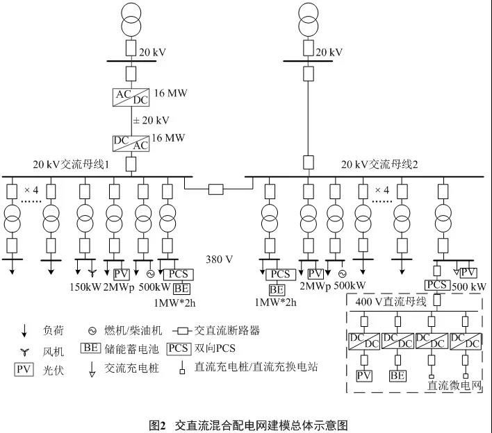 交直流混合配電網(wǎng)的詳細建模和多運行工況的仿真分析,將有效支撐主動配電網(wǎng)工程投運和可靠穩(wěn)定運行。然而目前大規(guī)模的基于柔直的交直流混合配電網(wǎng)系統(tǒng)級仿真的時效性和實用性不足。因此,本文基于實時數(shù)字仿真平臺RT-LAB 建立交直流混合主動配電網(wǎng)模型,為江蘇省基于柔性直流互聯(lián)的交直流混合主動配電網(wǎng)應(yīng)用示范工程,如圖2所示,該拓撲包含±20kV柔性直流互聯(lián)系統(tǒng)、分布式光伏、分布式風(fēng)電、儲能系統(tǒng)、電動汽車充換電負荷以及直流微網(wǎng)等可控單元及相應(yīng)變流器控制的詳細建模。