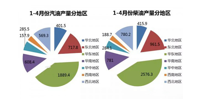 從1-4月份汽柴油分地區(qū)產(chǎn)量占比看,汽油方面華東地區(qū)累計產(chǎn)量在1889.4萬噸占比41%躍居第一,其次為東北地區(qū)累計產(chǎn)量在717.8萬噸占比16%,華南地區(qū)排名第三累計產(chǎn)量在608.4萬噸占比13%,上述三個地區(qū)占國內(nèi)汽油累計產(chǎn)量的70%;柴油方面華東地區(qū)累計生產(chǎn)2576.3萬噸占比43%位列第一,其次為東北地區(qū)累計柴油產(chǎn)量在961.5萬噸占比16%和華南地區(qū)累計生產(chǎn)781萬噸占比13%位列二三位,上述三個地區(qū)占國內(nèi)柴油累計產(chǎn)量的72%;由于上述地區(qū)集中分布中石化、中石油以及山東地方煉廠因此汽柴油產(chǎn)量較為集中,占全國汽柴油的比例較高,是國內(nèi)汽柴油產(chǎn)量的重要輸出地,2018年底隨著浙江石化一期2000萬噸以及大連恒力2000萬噸煉化一體化項目投產(chǎn),將對汽柴油主要輸出地華東以及東北地區(qū)產(chǎn)量重要影響,華東以及東北地區(qū)的汽柴油供應(yīng)占比將繼續(xù)提高,同時區(qū)域性的供需壓力將日益加劇。