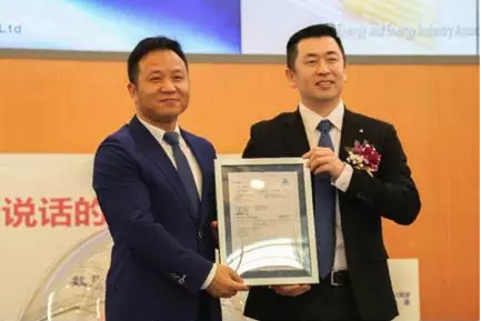 TUV頒發(fā)證書,大恒能源董事長謝申衡(左)領(lǐng)取證書并合影