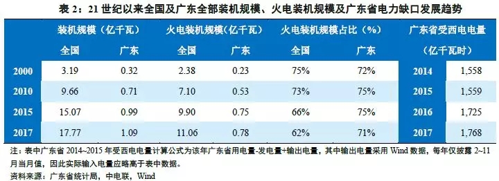 供給方面,截至2017年末,廣東省共有10,903萬(wàn)千瓦機(jī)組,位居全國(guó)第四。2005年以來(lái)火電機(jī)組占比即保持在75%左右(其中,煤電機(jī)組占火電機(jī)組比例超過(guò)八成),2017年,伴隨煤電限制新增產(chǎn)能投產(chǎn)政策的延續(xù),全年火電幾乎無(wú)增長(zhǎng),火電裝機(jī)占比下降至71%,但其主力電源地位仍將保持。