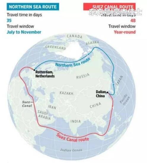 這不僅僅是因為北極地區(qū)擁有豐富的自然資源,也因為北極地區(qū)作為一個航運通道有極大地改變世界航運現(xiàn)狀的潛能。北極航道更短,在溝通亞洲和歐洲商業(yè)貿(mào)易上具有不可比擬的優(yōu)勢。